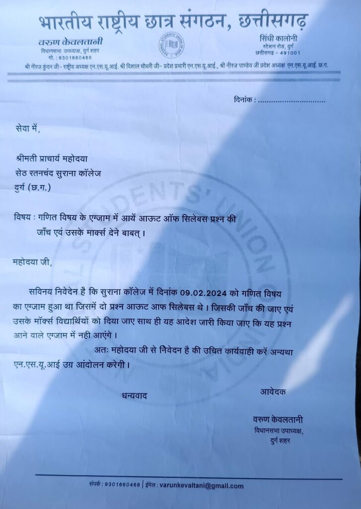 दुर्ग//परीक्षा में आए प्रश्न को लेकर भारतीय राष्टीय संगठन बैनर तले एनएसयूआई के छात्ओ ने कॉलेज प्रबंधन को सोपा ज्ञापन,, कहा आउट ऑफ सिलेबस के दो प्रश्नों का नबर विद्यार्थियों को दिया जाए