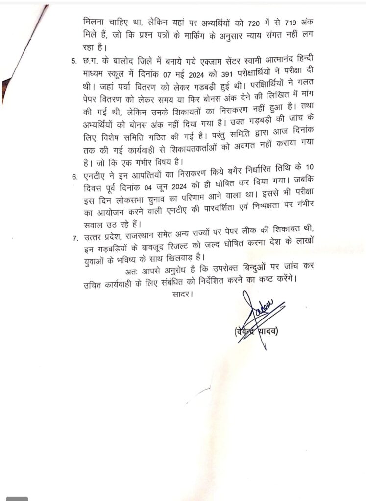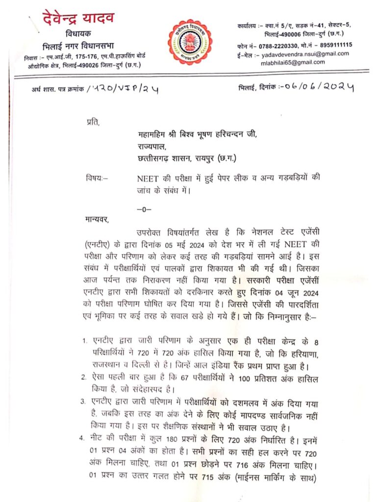 भिलाई. भिलाई नगर विधायक देवेंद्र यादव ने नीट -2024 में पेपर लीक एवं परिणाम से संबंधित अभ्यर्थियों की शिकायतों का निराकरण कर जल्द से जल्द न्याय दिलाने के लिए केन्द्र सरकार से सीबीआई से जांच कराने की मांग की है। अभ्यर्थियों के शिकायतों से संबंधित विषय को लेकर छत्तीसगढ़ के राज्यपाल को पत्र लिखा है और मुलाकात के लिए उनसे समय भी मांगा है।