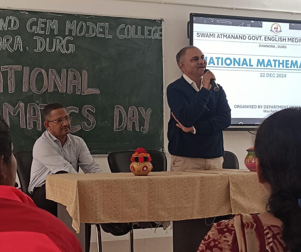 दुर्ग। स्वामी आत्मानंद शासकीय अंग्रेजी माध्यम आदर्श महाविद्यालय धनोरा में मैथमेटिक्स डे का आयोजन किया गया। कार्यक्रम के मुख्य अतिथि व्याख्याता गणित एवं जिला स्तरीय परीक्षक एच एस भुवाल थे। कार्यक्रम की अध्यक्षता महाविद्यालय के प्राचार्य विकास पंचाक्षरी ने की। मुख्य अतिथि श्री भुसावल ने गणित के महत्व और उसके इतिहास पर प्रकाश डाला ।कार्यक्रम में पीपीटी प्रेजेंटेशन, पोस्टर प्रतियोगिता, क्विज और नाटक का आयोजन भी किया गया। इस विभिन्न प्रतियोगिताओं में विद्यार्थियों ने भाग लिया और पुरस्कार प्राप्त किया। कार्यक्रम का संचालन बीएससी प्रथम सेमेस्टर के छात्र अद्वितीय निरंकारी द्वारा किया गया। आभार प्रदर्शन रेशमा वर्मा द्वारा किया गया। इस दौरान कॉलेज के प्राध्यापक श्रीमती कल्पना पांडे शुक्ला, डॉक्टर स्वाति तिवारी, विश्वनाथ ताम्रकार, श्वेता साहू, अतिथि सिंह, श्रीमती रितिका अवस्थी, विधा वर्मा, रेशमा वर्मा, संयुक्त संचालक उच्च शिक्षा विभाग डॉक्टर जी ए घनश्याम, अतिरिक्त संचालक उच्च शिक्षा विभाग राजेश पांडे, सहायक प्राध्यापक डॉक्टर देवयानी चौबे, भास्कर गंटी, डॉक्टर शिशिरकणा भट्टाचार्य, डॉक्टर चंद्रशेखर शर्मा मौजूद थे।