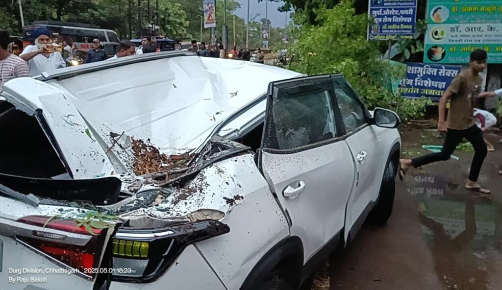 दुर्ग/में आंधी-तूफान के कहर के कारण नया बस स्टैंड के पास 100 साल पुराना नीम का पेड़ गिर गया। गनीमत रही कि इस हादसे में कई राहगीर बाल-बाल बच गए, लेकिन पेड़ के नीचे खड़ी एक कार बुरी तरह से क्षतिग्रस्त हो गई। पेड़ को कटर से काटा जा रहा है। पेड़ गिरने से कई बिजली के खंभे भी गिर गए, जिससे रोड ब्लॉक हो गया और यातायात प्रभावित हुआ।यातायात पुलिस बल द्वारा यातायात व्यवस्था बनाया गया।