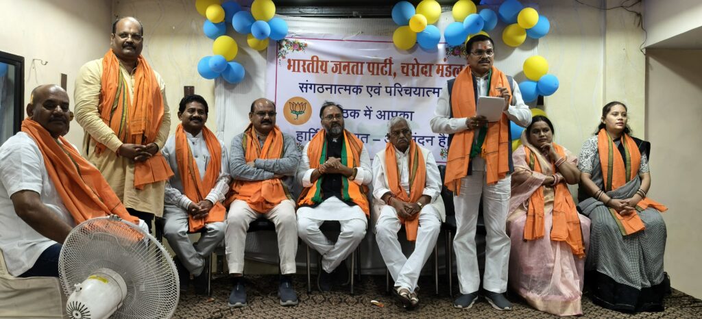 भारतीय जनता पार्टी, चरोदा मंडल द्वारा एक महत्वपूर्ण संगठनात्मक एवं परिचयात्मक बैठक का आयोजन होटल आनंद सागर में किया गया। इस बैठक में मुख्य अतिथि के रूप में अहिवारा विधायक माननीय राजमहंत डोमन लाल कोर्सेवाड़ा जी ने अपनी गरिमामयी उपस्थिति दर्ज कराई। साथ ही भिलाई जिला अध्यक्ष श्री पुरुषोत्तम देवांगन जी, विधायक प्रतिनिधि श्री सतीश साहू, जिला महामंत्री श्री प्रेमलाल साहू एवं श्री बिजेन्द्र सिंह भी विशेष रूप से उपस्थित रहे।