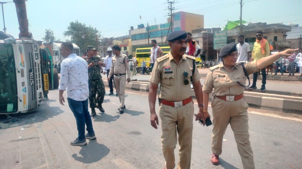 दुर्ग। नेशनल हाईवे में बसंत टॉकीज सामने अनियंत्रित होकर पलटी मालवाहक वाहन को यातायात पुलिस द्वारा तत्काल क्रेन की सहायता से हटाया गया। इस दौरान वीआईपी कारकेट निकलने एवं जाम की स्थिति निर्मित ना हो इसके लिए पेट्रोलिंग द्वारा लगातार वाहनों को डायवर्ट किया गया। शुक्रवार को स्टेरिंग फेल होने पर अनियंत्रित होकर पोल से टकराकर वाहन पलट गई थी। माल वाहक वाहन पावर हाउस ओवर ब्रिज से बसंत टॉकीज की ओर नीचे उतरते समय पोल से टकराकर पलट गयी थी, जिससे जाम की स्थिति निर्मित हो रही थी। सूचना मिलने ही तत्काल मौके पर पहुंची यातायात पुलिस ने जाम की स्थिति पर नियंत्रण किया और वाहनों का आवागमन सुचारू रूप से संचालित किया।