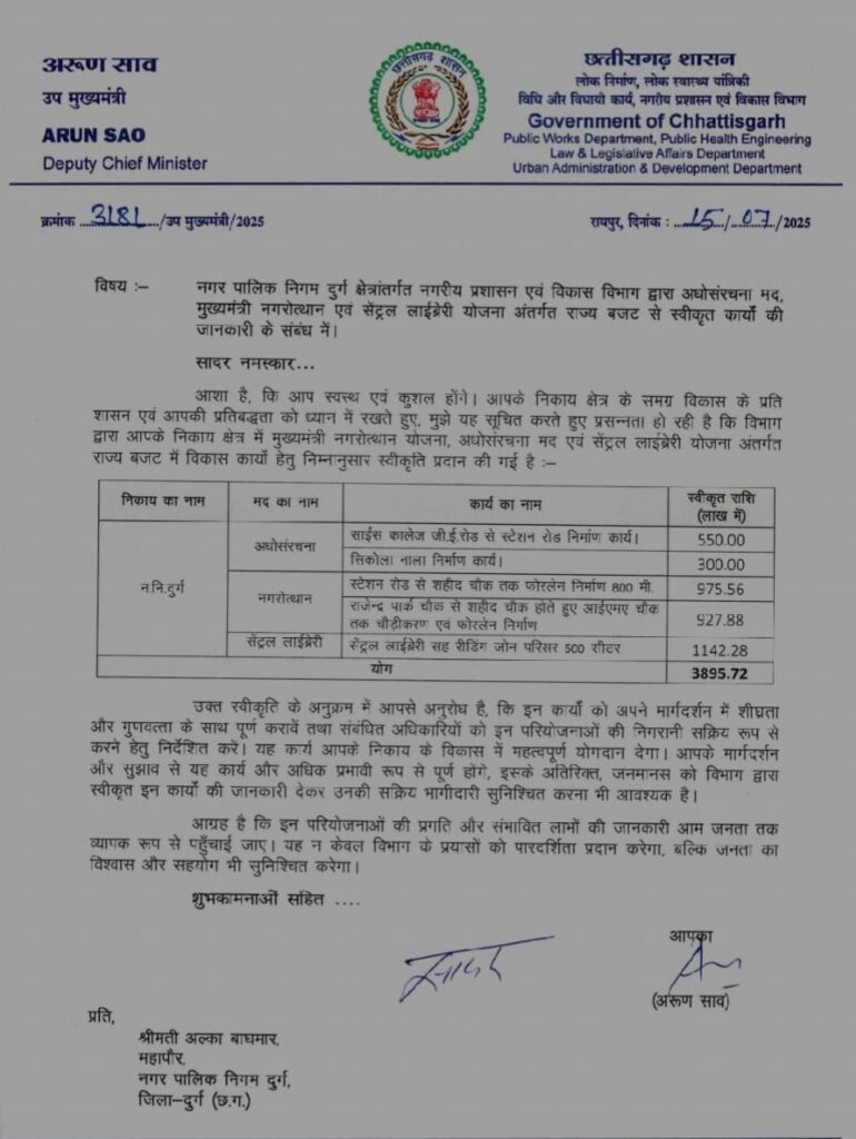 महापौर के द्वारा निरंतर वार्डो का दौरा कर जनता की मांगों के अनुरूप विकास कार्यों को पूरा करने हेतु सतत प्रयास किए जा रहे हैं। शहर दुर्ग की जनता को सुविधा और सहूलियत देने के उद्देश्य से की गई मांग के तहत उपमुख्यमंत्री श्री अरुण साव ने दुर्ग शहर विधानसभा क्षेत्र के समग्र विकास को प्राथमिकता देते हुए, नगरीय प्रशासन विभाग द्वारा नगर पालिक निगम दुर्ग को मुख्यमंत्री नगरोत्थान योजना, अधोसंरचना मद एवं सेंट्रल लाइब्रेरी योजना के अंतर्गत विभिन्न कार्यों के लिए स्वीकृति प्रदान की है।