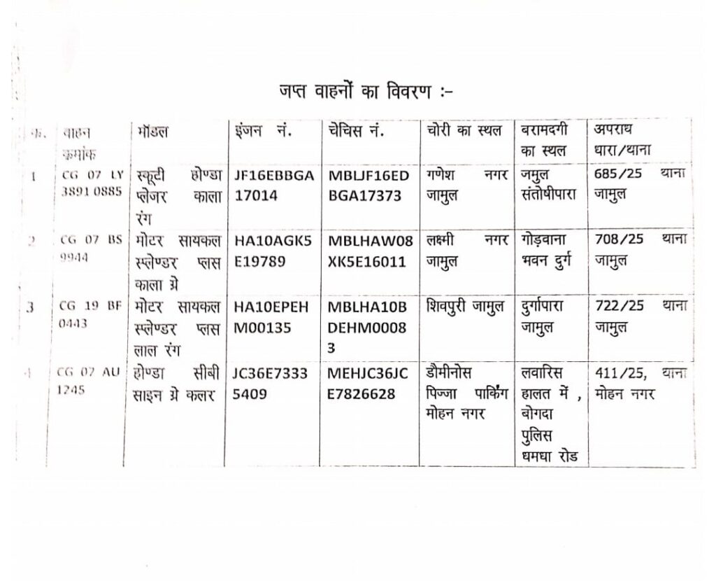 दरअसल, दुर्ग पुलिस द्वारा जिले में चलाए जा रहे ‘सशक्त एप अभियान’ के तहत लगातार लावारिस व चोरी की गाड़ियों की जांच की जा रही थी। इसी दौरान पटेल चौक दुर्ग में बिना नंबर की स्प्लेंडर बाइक को एप के माध्यम से चेक किया गया, जो चोरी की निकली। चालक से सख्ती से पूछताछ करने पर उसने 3 और मोटर साइकिल चोरी करने की बात कबूल की, जिनमें थाना मोहन नगर और थाना जामुल क्षेत्र की घटनाएं शामिल थीं।