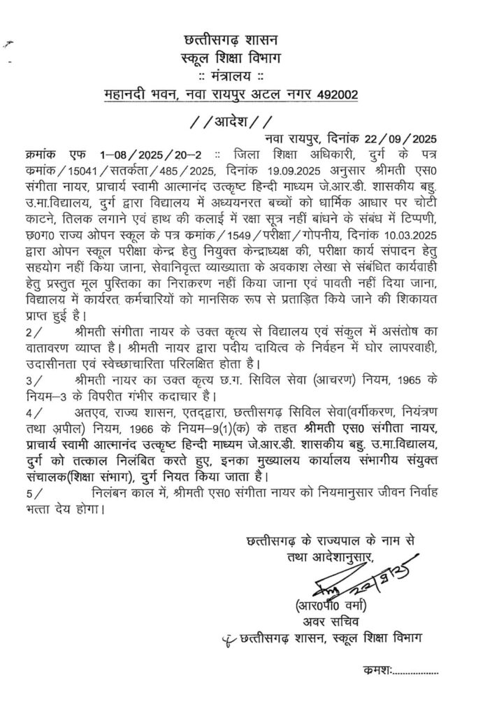 स्वामी आत्मानंद स्कूल दुर्ग की प्राचार्य संगीता नायर को राज्य सरकार ने निलंबित कर दिया है। उन पर धार्मिक प्रतीकों पर आपत्तिजनक टिप्पणी, परीक्षा कार्य में लापरवाही, दस्तावेज़ों का निपटारा न करना और कर्मचारियों से दुर्व्यवहार जैसे आरोप हैं।