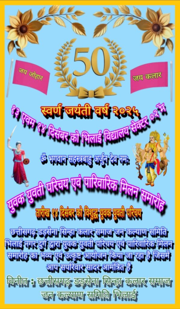 छत्तीसगढ़ भिलाई मे डड़सेना सिन्हा कलार समाज के द्वारा हर वर्ष की भांति इस वर्ष की पारिवारिक मिलन समारोह एवं युवक युवती परिचय सम्मेलन का आयोजन भिलाई सेक्टर 2 विद्यालय में किया जा रहा है यह आयोजन 13 व 14 दिसंबर को दो दिवसीय रखा गया है जिसमें प्रथम दिन महिलाओं के लिए खास कार्यक्रम रखा गया है जिसमें महिलाओं के लिए विभिन्न प्रतियोगिता होगी व बच्चों का सम्मान समारोह होगा वहीं द्वितीय दिन युवक की युवती परिचय सम्मेलन एवं समाज के विशिष्ट जनों के साथ-साथ समाज को उत्कृष्ट स्थान पर पहुंचने वाले सामाजिक जनों का सम्मान समारोह किया जाएगा मुख्य अतिथि के रूप में कैबिनेट मंत्री का गजेंद्र यादव व दुर्ग संभाग सांसद विजय बघेल जी उपस्थित रहेंगे समाज के अध्यक्ष सुमन सागर सिन्हा जी ने बताया कि इस वर्ष यह सम्मेलन खास है क्योंकि परिचय सम्मेलन का यह 50वां वर्ष है जिसमें हम छत्तीसगढ़ी संस्कृति को ध्यान में रखते हुए कार्यक्रम कर रहे हैं जिसमें ब्लड डोनेशन के साथ-साथ युवाओं के लिए रोजगार उपलब्ध कराने के लिए रोजगार मेले का भी आयोजन किया जाएगा अध्यक्ष महोदय ने समाज के सभी लोगों से अनुरोध किया के इस कार्यक्रम में उपस्थित रहकर इस कार्यक्रम को सफल बनाने में सहयोग प्रदान करें।।।।
