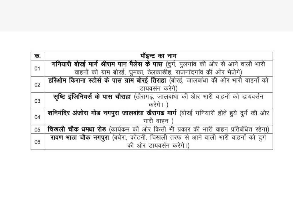 यातायात पुलिस ने बताया कि गनियारी बोरई मार्ग श्रीराम पान पैलेस के पास दुर्ग,पुलगांव की ओर से आने वाली भारी वाहनों को ग्राम बोरई ,घुमका, ठेलका डीह, राजनांदगांव की ओर से भेजा जाएगा। हरिओम किराना स्टोर के पास ग्राम बोरई तिराहा की ओर से भारी वाहनों को डायवर्सन करेंगे। सृष्टि इंजीनियर के पास चौराहा पर भारी वाहनों को डायवर्सन किया जाएगा। शनि मंदिर अंजोरा मोड नगपुरा ,जल बांधा, खैरागढ़ मार्ग की ओर से भारी वाहनों का आवागमन रखा जाएगा। चिखली चौक, धमधा रोड से कार्यक्रम की ओर किसी भी प्रकार की भारी वाहन को प्रतिबंधित रखा जाएगा। रावण भाठा चौक नगपुरा की ओर से भारी वाहनों को दुर्ग की ओर डायवर्सन करेंगे दुर्ग, कोटनी, भिलाई, रायपुर की ओर से आने वाले श्रद्धालु गण बाजार चौक से बिजली सब स्टेशन के आगे पार्किंग में अपनी वाहनों को खड़ा करेंगे। बाईपास महमरा, गनियारी, अंजोरा की ओर से आने वाले श्रद्धालुगण नगपुरा पुलिस चौकी के बगल मैदान में वाहन पार्क करेंगे। खैरागढ़, जाल बांधा, धमधा की ओर से आने वाले श्रद्धालु गण नगपुरा चौकी के पहले दाएं बाएं और पार्किंग में वाहन पार्क करेंगे। बोरई, राजनांदगांव, घुमका, पटेवा की ओर से आने वाले वाहन नगपुरा चौक के पहले डीके फर्नीचर दुकान के पीछे पार्किंग में अपनी वाहन खड़ी करेंगे। वीआईपी पार्किंग कथा स्थल के पीछे रहेगा।