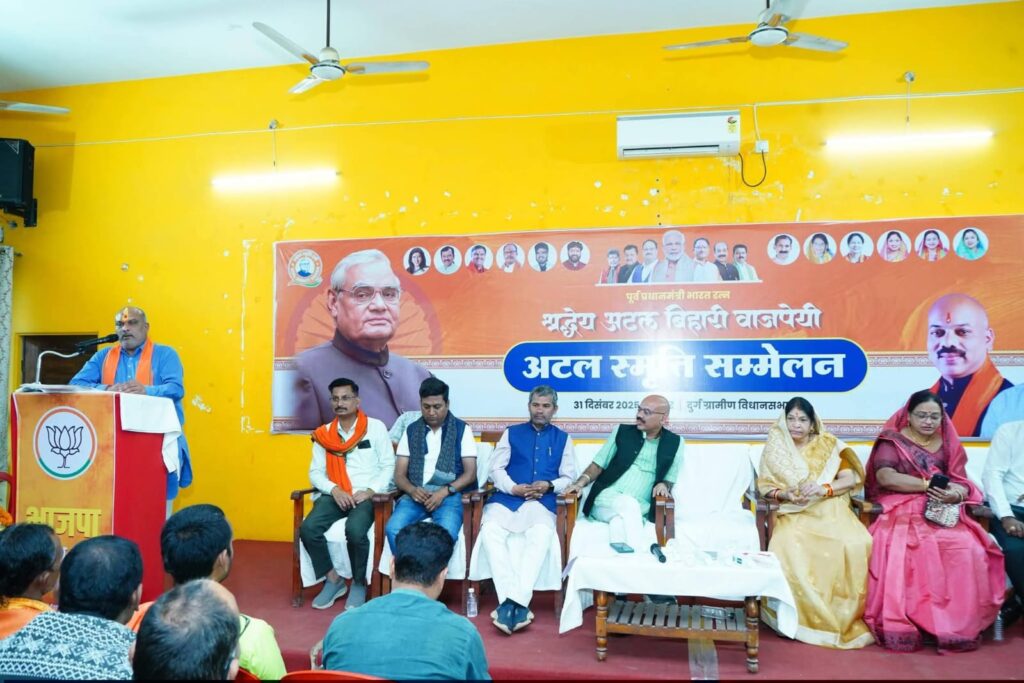 दुर्ग। भारतीय जनता पार्टी के राष्ट्रीय एवं प्रदेश नेतृत्व के निर्देशानुसार भारत रत्न, छत्तीसगढ़ राज्य के निर्माता एवं राजनीति के अजातशत्रु स्व. अटल बिहारी वाजपेयी की जन्म शताब्दी वर्ष के अंतर्गत अटल स्मृति दुर्ग ग्रामीण विधानसभा स्तरीय कार्यक्रम का आयोजन जिला भाजपा कार्यालय में किया गया। कार्यक्रम की अध्यक्षता जिला भाजपा अध्यक्ष सुरेंद्र कौशिक ने की। मुख्य अतिथि के रूप में छत्तीसगढ़ ग्रामीण विकास प्राधिकरण एवं पिछड़ा वर्ग विकास प्राधिकरण के उपाध्यक्ष तथा दुर्ग ग्रामीण विधायक ललित चंद्राकर उपस्थित रहे।