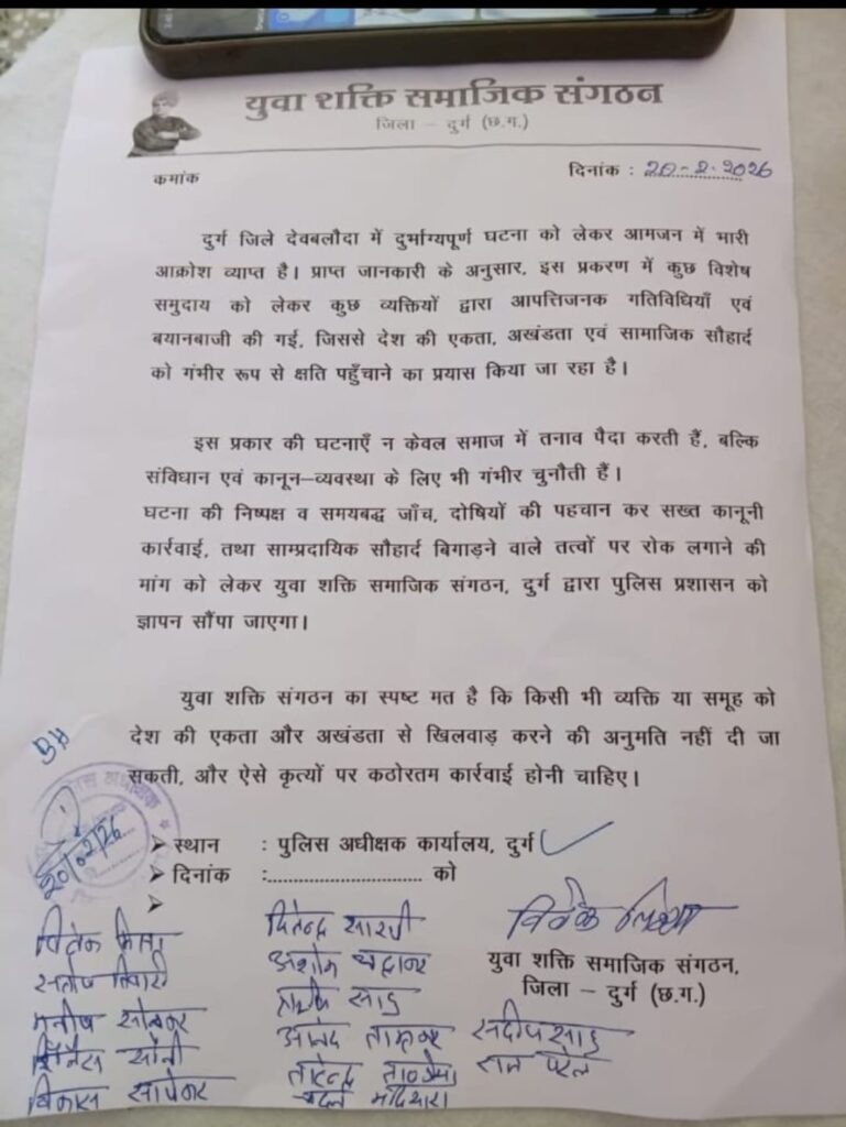 दुर्ग जिले देवबलौदा में दुर्भाग्यपूर्ण घटना को लेकर युवा शक्ति समाजिक संगठन, दुर्ग द्वारा पुलिस अधीक्षक दुर्ग को ज्ञापन सौंप कर कार्यवाही की मांग की गयी। घटना से आमजन में भारी आक्रोश व्याप्त है। प्राप्त जानकारी के अनुसार, इस प्रकरण में कुछ विशेष समुदाय को लेकर कुछ व्यक्तियों द्वारा आपत्तिजनक गतिविधियाँ एवं बयानबाजी की गई, जिससे शहर प्रदेश के साथ देश की एकता, अखंडता एवं सामाजिक सौहार्द को गंभीर रूप से क्षति पहुँचाने का प्रयास किया जा रहा है।युवा शक्ति संगठन के अध्यक्ष विवेक मिश्रा ने कहा कि इस प्रकार की घटनाएँ न केवल समाज में तनाव पैदा करती हैं, बल्कि संविधान एवं कानून-व्यवस्था के लिए भी गंभीर चुनौती हैं। घटना की निष्पक्ष व समयबद्ध जाँच, दोषियों की पहचान कर सख्त कानूनी कार्रवाई, तथा साम्प्रदायिक सौहार्द बिगाड़ने वाले तत्वों पर रोक लगाने की माँग की । युवा शक्ति संगठन का स्पष्ट मत है और प्रशासन से मांग है कि किसी भी व्यक्ति या समूह को देश की एकता और अखंडता से खिलवाड़ करने की अनुमति नहीं दी जा *सकती, और ऐसे कृत्यों पर कठोरतम कार्रवाई होनी चाहिए। ज्ञापन देने वालों में विवेक मिश्रा, संतोष तिवारी, आनंद ताम्रकार,मनीष सोनकर, शिवेश सोनी, विकास सापेकर, सैयद आसिफ, जितेंद्र सारथी, अशोक चंद्राकर , ऋषि साहू, सुधीर चंदेल, तारेंद्र टांडिया , चंदन मटियारा, संदीप साहू , राज पटेल सहित अन्य युवा गण उपस्थित रहे ।