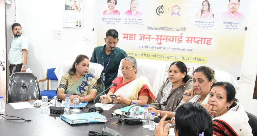 दुर्ग। छत्तीसगढ़ राज्य महिला आयोग की अध्यक्ष डॉ. किरणमयी नायक की उपस्थिति में दुर्ग संभाग में महा जनसुनवाई आयोजित की गई। इसमें दुर्ग, बालोद, बेमेतरा, कबीरधाम, राजनांदगांव सहित अन्य जिलों के कुल 113 प्रकरणों की सुनवाई हुई, जिनमें से 41 प्रकरण मौके पर ही नस्तीबद्ध किए गए। सुनवाई के दौरान आयोग की समझाइश पर एक व्यक्ति 12 लाख रुपये का बैंक कर्ज पटाने के लिए तैयार हुआ, वहीं एक शिक्षक ने अपनी शिक्षिका पत्नी से सार्वजनिक रूप से माफी भी मांगी। कार्यक्रम में महिला एवं बाल विकास विभाग, पुलिस प्रशासन, विधिक प्राधिकरण और सखी केंद्र का सहयोग रहा।